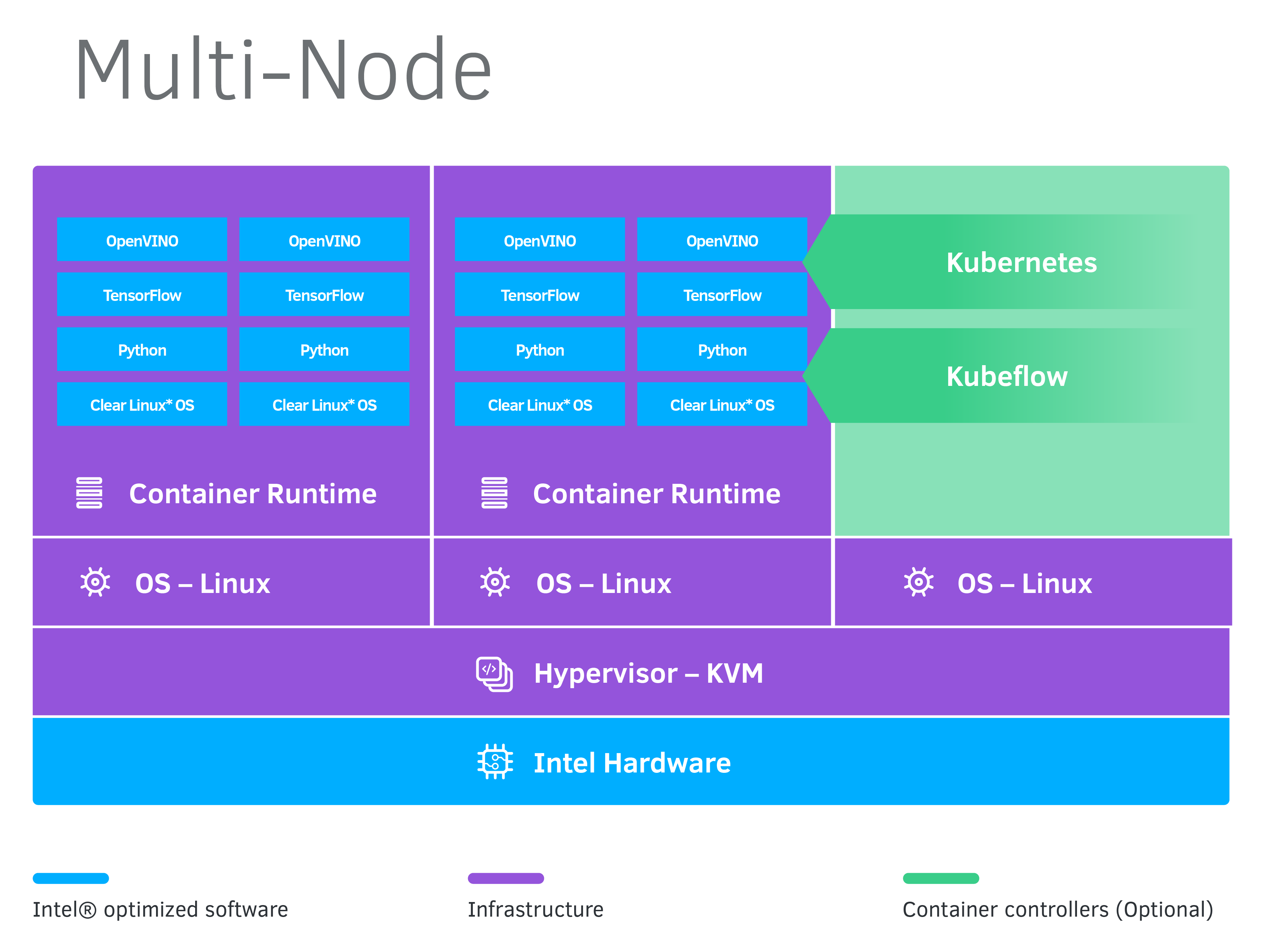 - Orchestration: Kubernetes to manage and orchestrate containerized applications for multi-node clusters with Intel platform awareness.