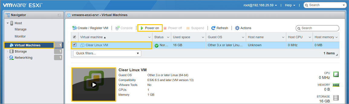 Figure 16: VMware ESXi - Navigator > Virtual Machines > Power on VM¶